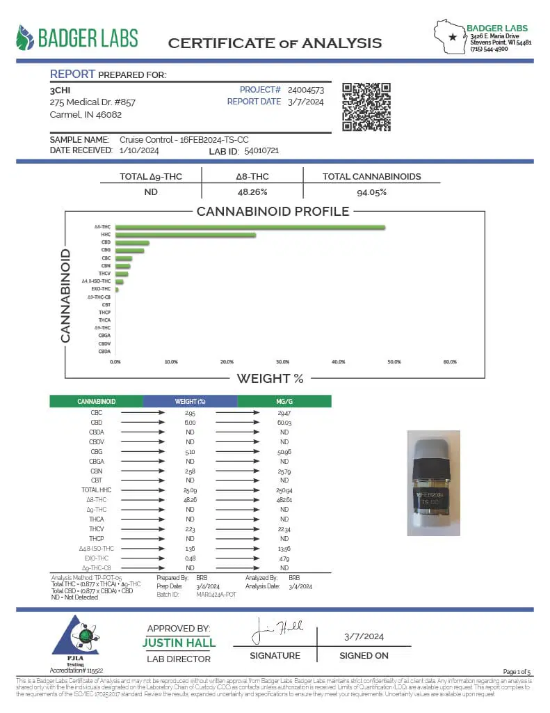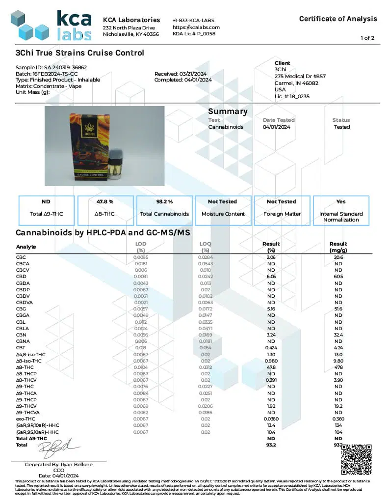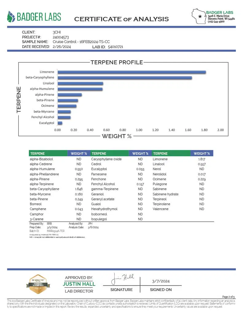Every 3CHI product undergoes third-party lab testing to ensure purity, potency, and safety. The Cruise Control strain is free from pesticides, heavy metals, and harmful additives. View lab results directly on 3CHI’s official website.