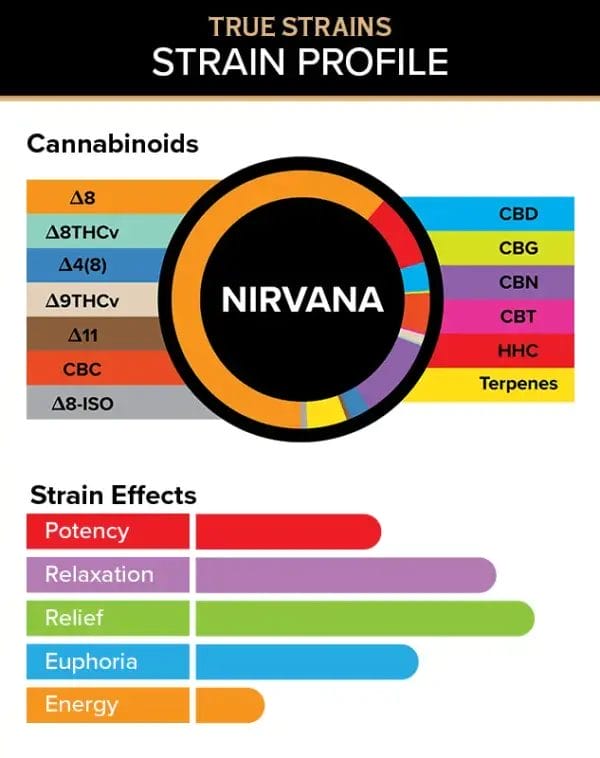 The True Strain series by 3CHI is designed to replicate the exact effects of well-known cannabis strains. The Nirvana strain delivers a strong body high, deep relaxation, and mental tranquility, making it a perfect choice for stress relief and nighttime use.
