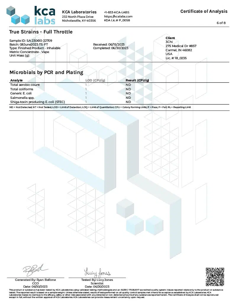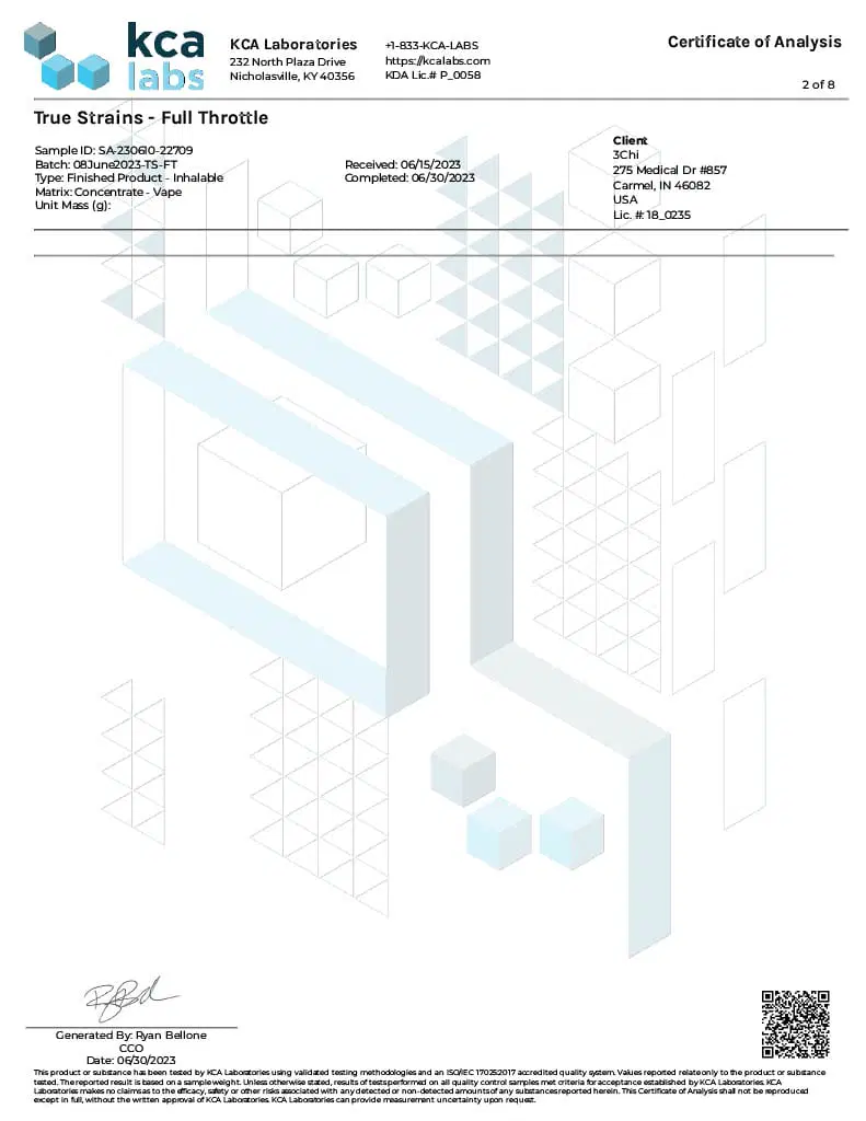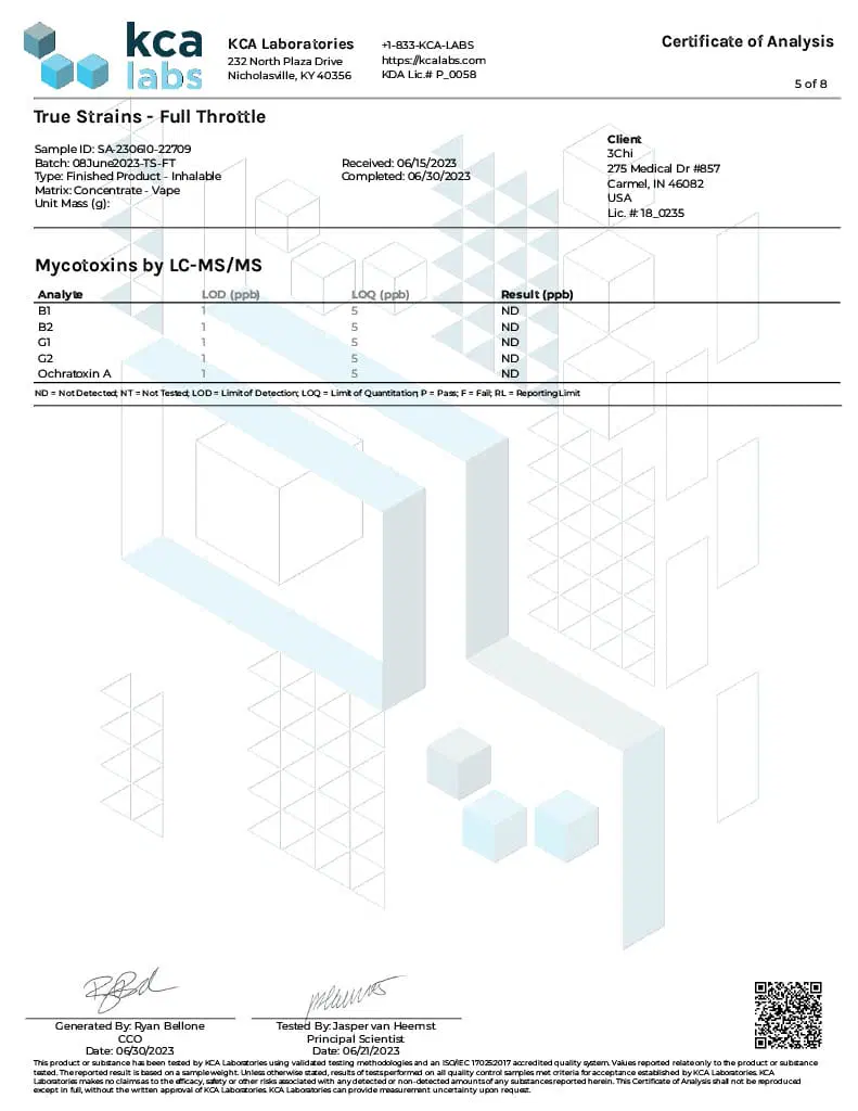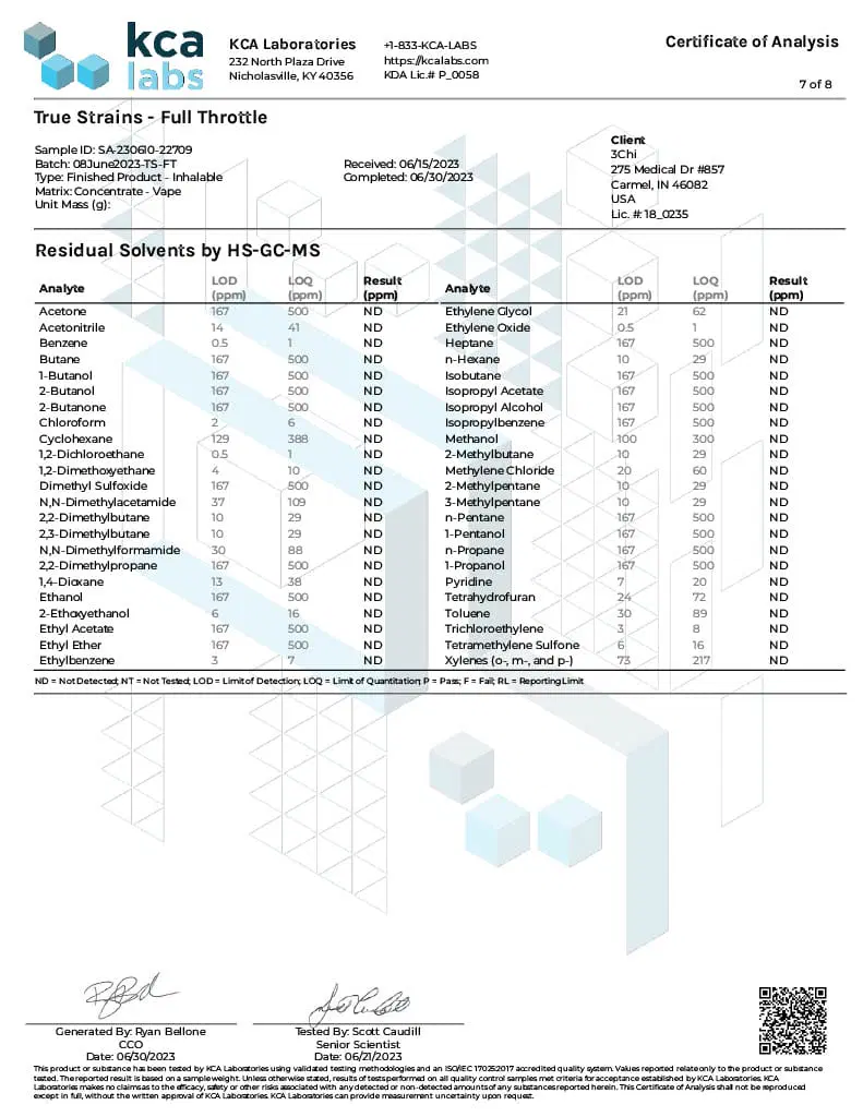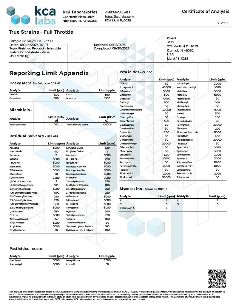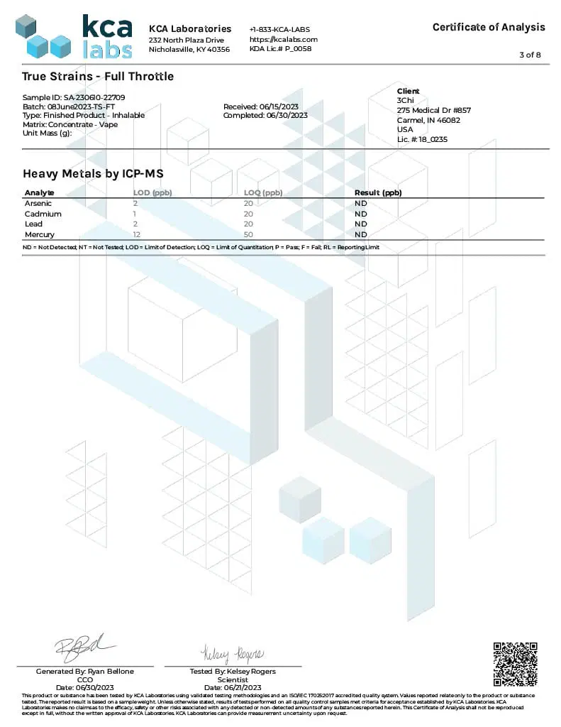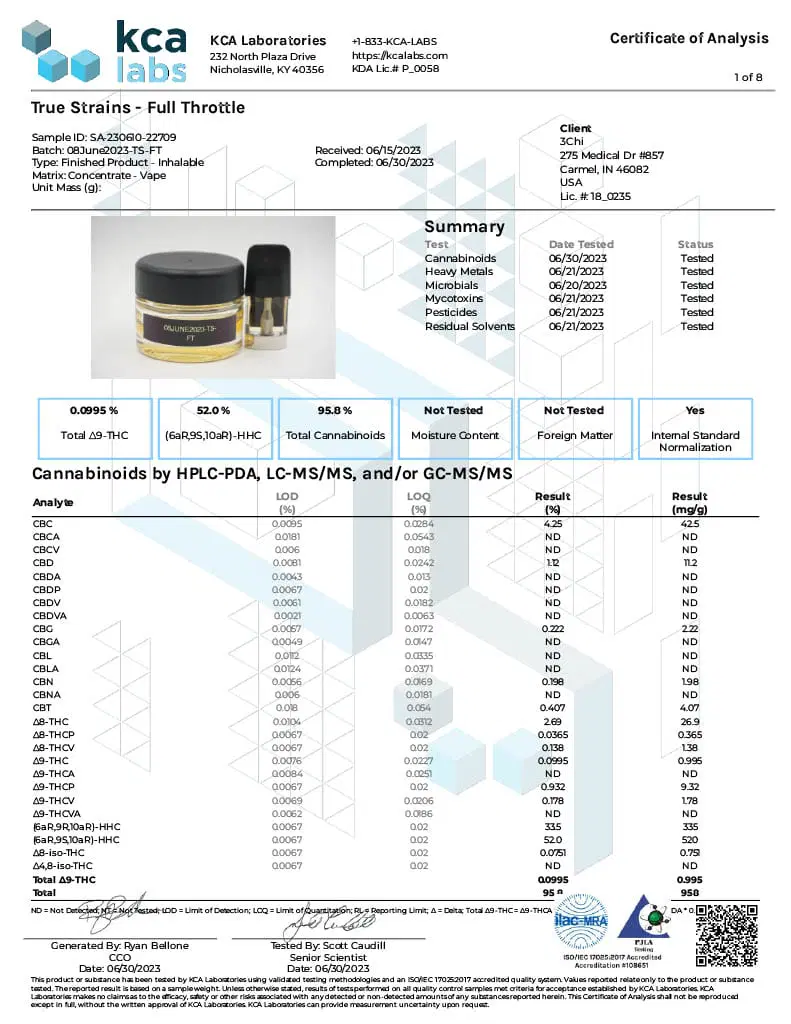 All 3CHI products undergo rigorous third-party lab testing to ensure purity, potency, and safety. The Full Throttle vape pod is free from pesticides, heavy metals, and harmful additives, making it a clean and safe option for cannabis enthusiasts. You can view lab results directly on 3CHI’s official website.