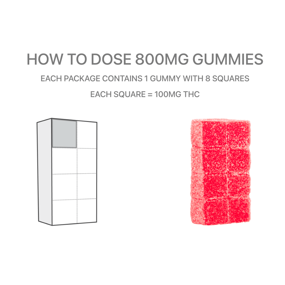 If you’re new to high-dose edibles, it’s a good idea to start with a small piece of the gummy. The full 800mg package is meant for those with a higher tolerance, so begin with a quarter or half of a gummy to gauge your body’s reaction. -